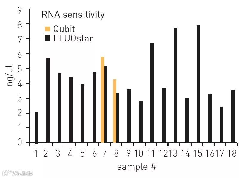 下图为FLUOstar omega和Qubit荧光检测仪的RNA检测灵敏度比对