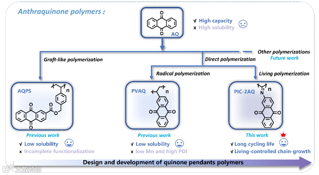 图1.蒽醌小分子和蒽醌侧链聚合物的发展历程、分子结构性能及未来发展方向。