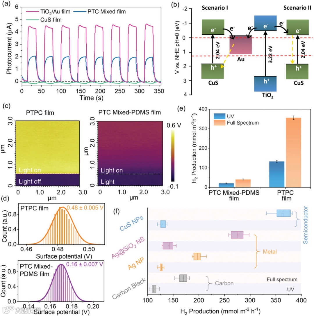 图5. a) CuS薄膜、TiO2/Au/CuS PTC混合薄膜和TiO2/Au薄膜的光电流响应。b) TiO2/Au/CuS混合催化剂的两种可能电荷转移路径示意图。c) PTPC薄膜和TiO2/Au/CuS PTC混合PDMS薄膜在黑暗和紫外光照射下的开尔文探针力显微镜(KPFM)形貌图。d) PTPC薄膜和TiO2/Au/CuS PTC混合PDMS薄膜在紫外光照射下的接触电势差(CPD)信号直方图。e) PTPC薄膜和TiO2/Au/CuS PTC混合PDMS薄膜在紫外光和全光谱照射下的平均氢气产率对比。f)应用不同光热材料的PTPC薄膜在紫外光和全光谱照射下的氢气产率。