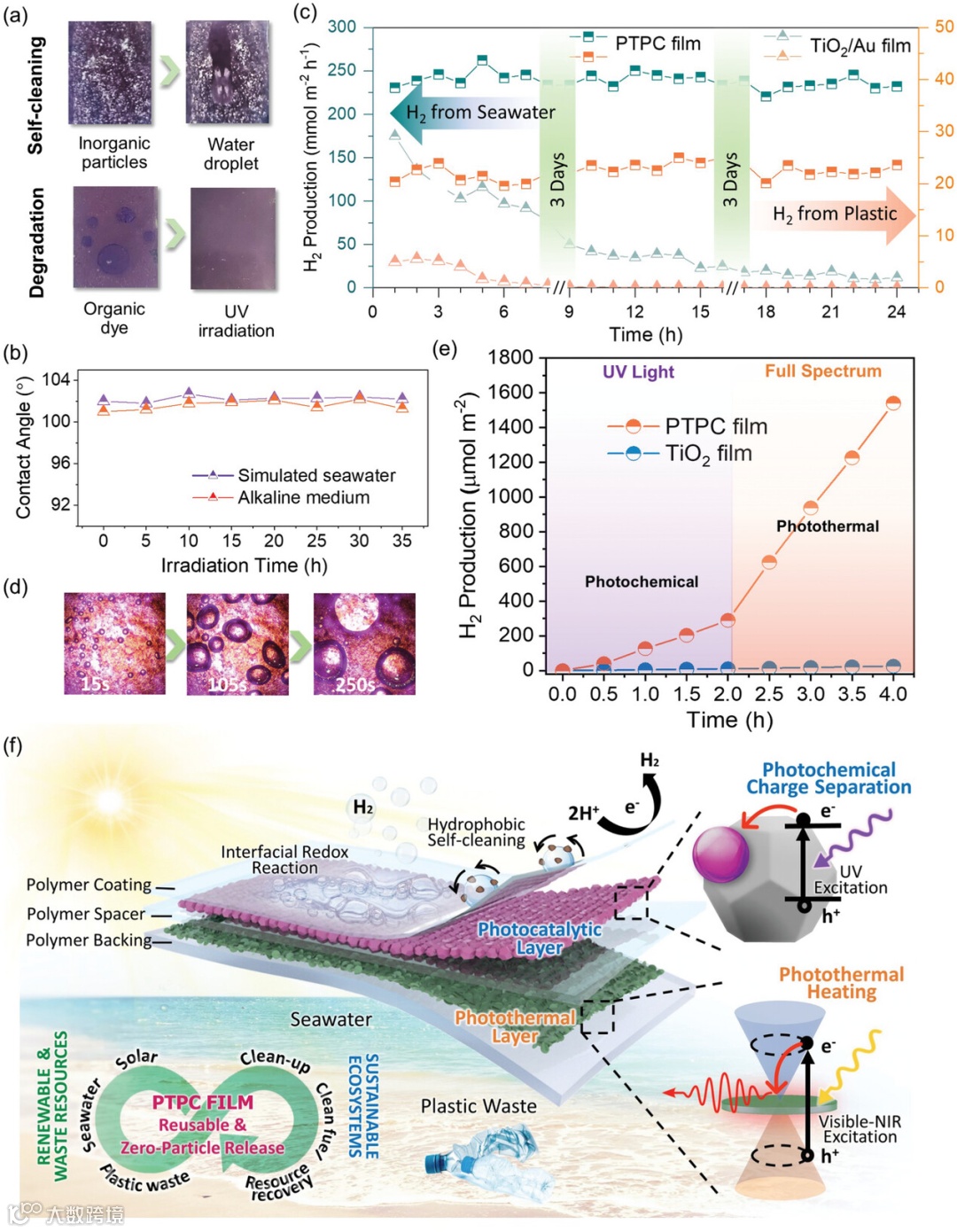 图6. a) PTPC薄膜对无机和有机污染物的自清洁功能。b) PTPC薄膜在模拟海水和碱性介质中随时间的接触角变化。c) PTPC薄膜与TiO2/Au薄膜在海水和塑料废物中产氢稳定性对比。d) 氢气气泡随时间演变的显微镜图像。e) TiO2薄膜和PTPC薄膜的平均氢气产量。f) PTPC薄膜的界面氧化还原反应示意图。