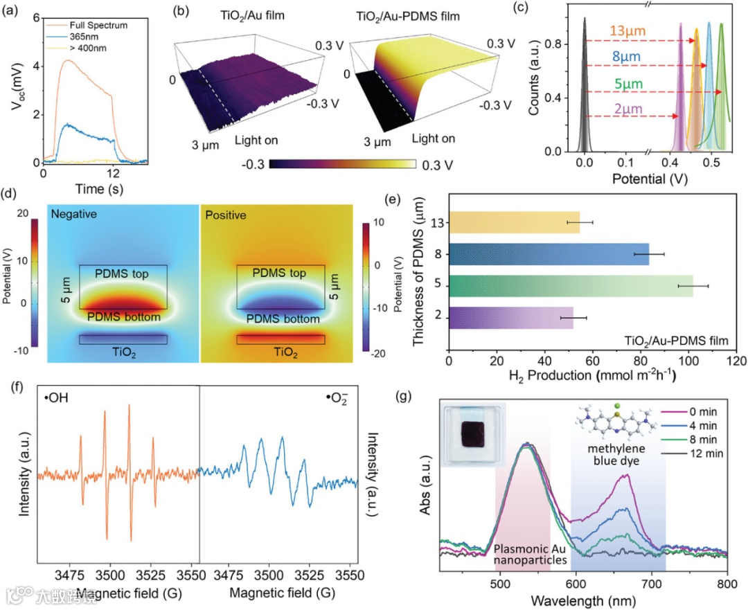 图4. a) TiO2/Au-PDMS 层在 紫外光(365 nm)、可见光和全光谱照射下的光电压。b) TiO2/Au 薄膜和 TiO2/Au-PDMS 薄膜的表面电势分布图。c) 不同 PDMS 层厚度的 TiO2/Au-PDMS 薄膜的接触电位差 (CPD) 曲线。d) COMSOL Multiphysics 模拟显示 TiO2诱导在 PDMS 表面的电势分布。e) 不同 PDMS 层厚度的 TiO2/Au-PDMS 薄膜的平均氢气产出速率。f) TiO2/Au-PDMS 薄膜在光照 10 分钟后的 •OH 和 •O2- 自由基的 EPR 信号。g) TiO2/Au-PDMS 薄膜光催化降解亚甲蓝染料的吸收光谱。