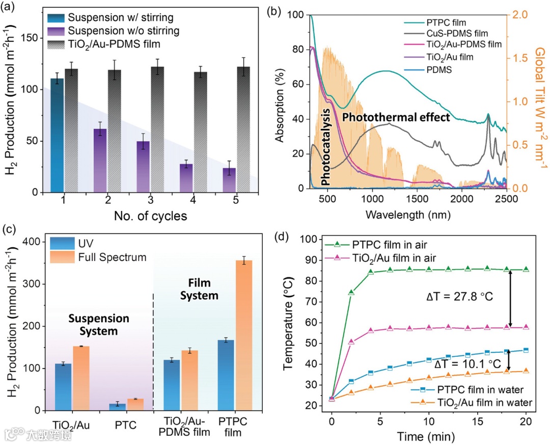 图3. a) 悬浮体系(有/无搅拌)与 TiO2/Au-PDMS 薄膜体系的制氢活性对比。b) PDMS、TiO2/Au 薄膜、TiO2/Au-PDMS 薄膜、CuS-PDMS 薄膜、PTPC 薄膜的吸收光谱以及标准太阳光谱(AM 1.5)。c) TiO2/Au 光催化剂和 TiO2/Au/CuS 混合催化剂(标记为 PTC)的悬浮体系以及 TiO2/Au-PDMS 薄膜和 PTPC 薄膜体系在紫外和全光谱照射下的制氢活性。d) TiO2/Au 薄膜和 PTPC 薄膜在空气和水中的温度曲线。