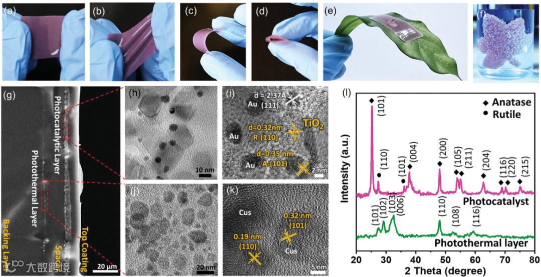 PTPC 薄膜具有卓越的机械性能与优异的柔韧性,能够拉伸、弯曲、扭转和折叠而不会丧失功能(图 2a-d)。该薄膜可以贴合不规则表面,并可根据特定应用进行塑形,甚至可以模拟“人造叶子”进行光合作用产氢(图 2e-f)。扫描电子显微镜 (SEM)证实了其具有均匀的三明治状多层结构,而透射电子显微镜(TEM) 则显示了清晰的 TiO₂/Au 和 CuS 纳米级畴(图 2g-k)。X 射线衍射(XRD)证实了锐钛矿相/金红石相 TiO₂ 以及结晶 CuS 的存在(图 2l)。
