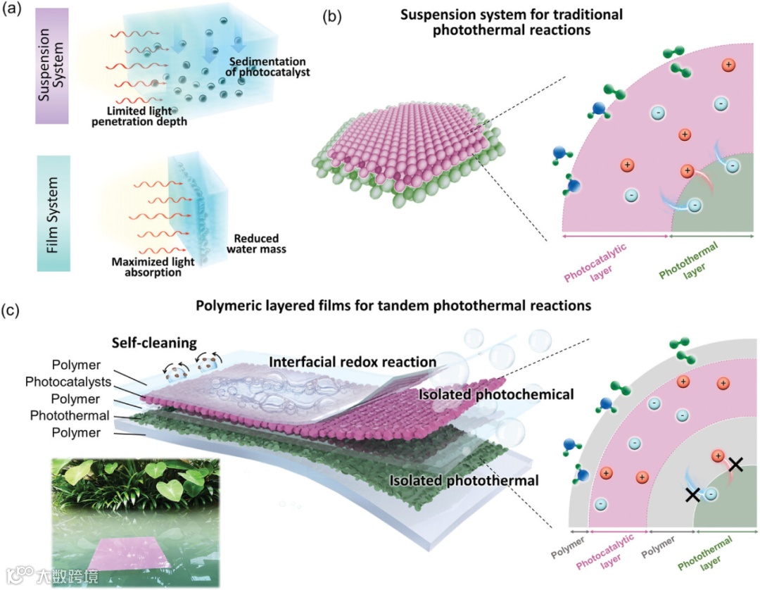 图1. a)传统悬浮体系与薄膜体系的对比。b)传统光热反应的悬浮体系。c)柔性聚合物串联光热催化(PTPC)薄膜,具有协同光热和光化学效应,可从海水和塑料废物中生产氢气。