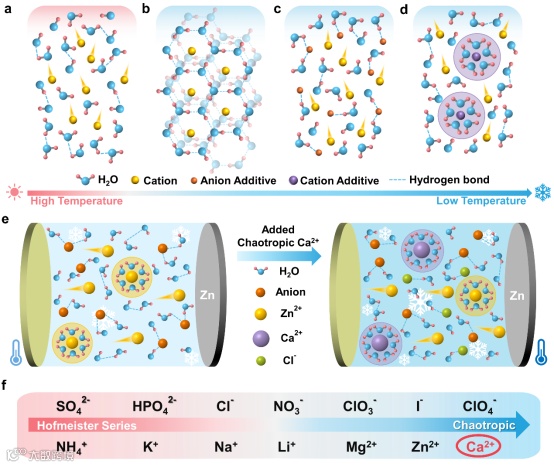 图5.(a)-(d)含水电解质的冷冻和防冻机制。(e)Ca2+添加剂的通用阴离子非依赖性抗冻机理图。(f)霍夫迈斯特系列。