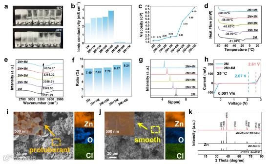 图1.(a)2 M Zn(ClO4)2电解质与不同浓度CaCl2添加剂(0 M-7 M)在-40°C和-60°C下的状态。(b)室温下对称不锈钢电极电池中不同浓度CaCl2添加剂电解质的离子电导率。含有不同浓度Ca2+添加剂的样品的(c)粘度,(d)DSC,(e)FTIR和(f)通过拟合获得的不同强度的HBs的比例,以及(g)具有不同浓度CaCl2添加剂的电解质的1H NMR。(h)室温下的LSV。在3mA cm-2、9mAh cm-2后,对含有电解质(i)2M和(j)2M+4M的Zn||Ti电池的Ti箔进行SEM和EDS表征。(k)经过3mA cm-2、9mAh cm-2沉积后沉积物的XRD。