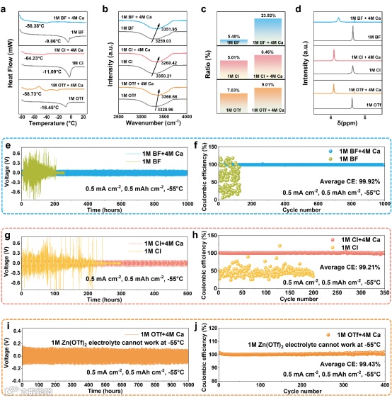 图4. 含有4M CaCl2添加剂的不同电解质盐的(a)DSC、(b)FTIR、(c)弱HB比和(d)1H NMR。在-55℃下0.5 mAh cm-2下使用(e,f)Zn(BF4)2基电解质、(g,h)ZnCl2基电解质和(i,j)Zn(OTf)2基电解液Zn||Zn电池的恒电流放电和充电电压曲线和CE图。