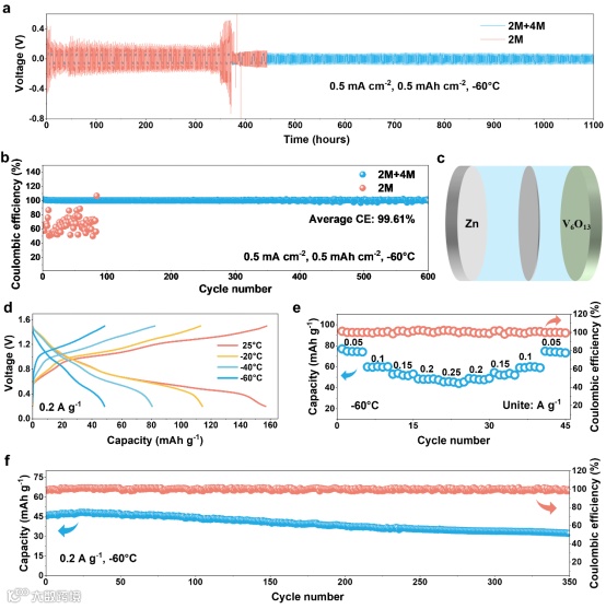 图3.(a)Zn||Zn电池的恒电流放电和充电电压曲线,(b)在-60℃下,不同电解质的Zn||Cu电池在0.5mA cm-2和0.5mAh cm-2下的CE图。(c)ZIB的示意图。(d)ZIB在不同温度下的恒电流充放电曲线。(e)ZIB在-60°C下的不同倍率性能和(f)循环性能。