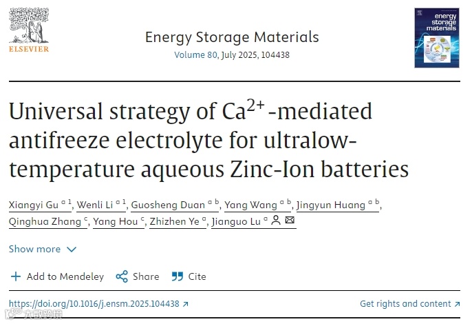 Xiangyi Gu, Wenli Li, Guosheng Duan, Yang Wang, Jingyun Huang, Qinghua Zhang, Yang Hou, Zhizhen Ye, Jianguo Lu, Universal Strategy of Ca2+-Mediated Antifreeze Electrolyte for Ultralow-Temperature Aqueous Zinc-Ion Batteries, Energy Storage Materials (2025),