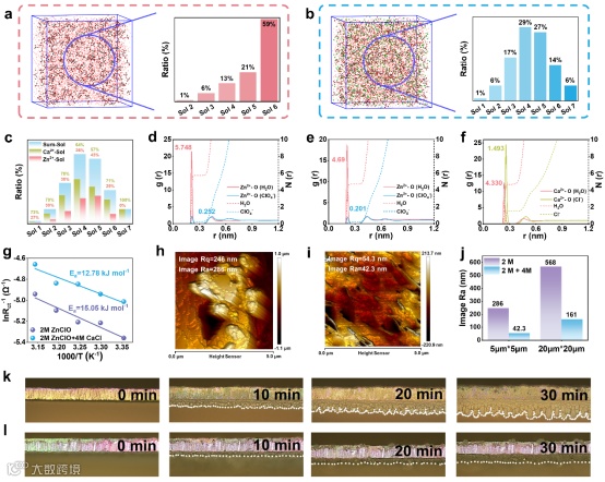图2.(a)2M和(b)2M+4M电解质的MD模拟的快照和溶剂化结构比。(c)2M+4M电解质体系中Zn2+和Ca2+溶液结构的比例。(d)2M电解质体系中Zn2+的RDF和配位数。(e)Zn2+和(f)Ca2+在2M+4M电解质体系中的RDF和配位数。(g)由Arrhenius方程拟合的脱溶活化能。在(h)2 M和(i)2 M+4 M电解质中50次循环(10 mA cm-2,1 mAh cm-2)后,锌阳极的AFM图像(5μm*5μm)。(j)不同观察范围下的图像Ra的比较。15mA cm-2下(k)2M和(l)2M+4M电解质中镀锌的原位光学显微镜图像。