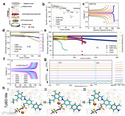 Fig. 4. Solid-state LFP battery internal structure diagram (a). Rate performance of liquid battery and solid-state battery with TpBD-Me, TpBD-NO2 and TpBD electro-lytes (b). Charge/discharge curves at different current density with 0.1, 0.2, 0.5, 1, 2 and 3C of TpBD-Me (c). Cycling stability of liquid battery and solid-state battery at 0.5 C (d) and 1 C (e). Charge/discharge curves at different cycle numbers of TpBD-Me at 1 C (f). In situ FT-IR spectra testing of LFP batteries for TpBD-Me (g). Li+ migration paths simulation by MD calculations (h).