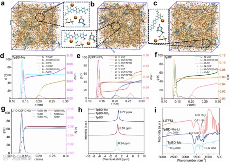 Fig. 2. MD simulation showing the final box of the simulated system after 100ns equilibrium of TpBD-Me (a), TpBD-NO2(b) and TpBD (c). MD simulations are performed to calculate the radial distribution function RDF and coordination number profile N(r) of Li with other molecules in the system for TpBD-Me (d), TpBD-NO2(e) and TpBD (f). Comparison of the coordination of the C=O bond to the Li (g). Solid-state 17Li NMR spectra (h). FT-IR spectra after doping with LiTFSI for TpBD-Me (i).