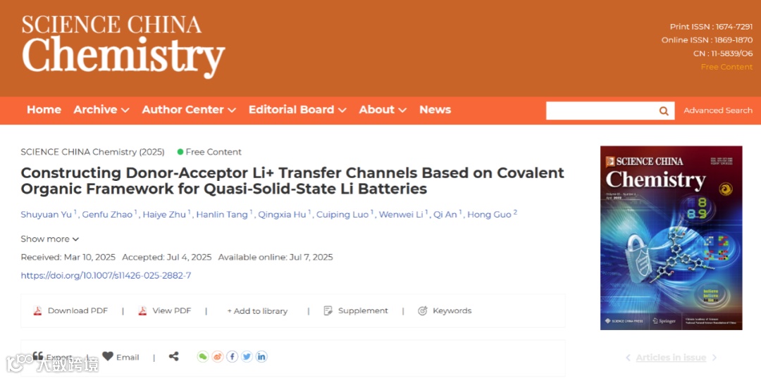 云南郭洪教授团队Science China Chemistry: 构建供体-受体策略的共价有机框架基准固态电解质Li+传输通道