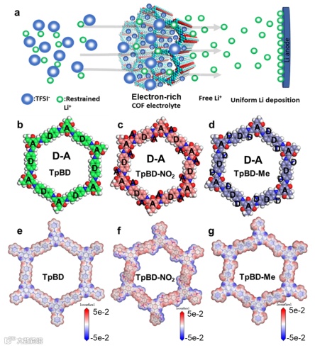 Fig. 1. The scheme of COF-based electrolyte regulated electronic density for in-ducing uniform Li+ deposition (a). Constructed D-A by TpBD (b), D-A by TpBD-NO2 (c) and D-A by TpBD-Me (d). The electrostatic potential of TpBD (e), TpBD-NO2(f) and TpBD-Me (g)