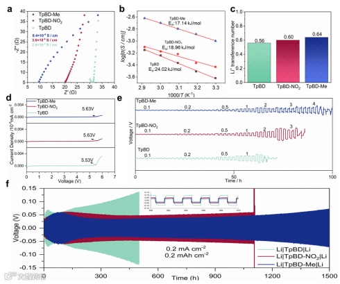 Fig. 3. Electrochemical impedance spectrum at 303K of TpBD-Me, TpBD-NO2 and TpBD (a). Calculation of ion mobility energy by measuring variable temperature impedance of TpBD-Me, TpBD-NO2 and TpBD (b). Li+ migration number of TpBD-Me, TpBD-NO2 and TpBD (c). Electrochemical window of TpBD-Me, TpBD-NO2 and TpBD (d). Critical current density for Li| COFs SSE |Li (e). Galvanostatic performance of symmetric Li batteries with TpBD-Me, TpBD-NO2 and TpBD at 0.2 mA cm–2, insets: enlarged voltage profiles for different times (f).