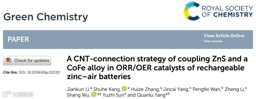 近日,来自西北民族大学的吴尚教授与兰州文理学院的杨全录教授合作,在国际知名期刊Green Chemistry上发表题为“A CNT-connection strategy of coupling ZnS and a CoFe alloy in ORR/OER catalysts of rechargeable zinc-air batteries”的科研论文。该成果提出了一种CNTs连接策略,通过CNTs交织互联,成功制备了具有层次化多孔结构,且富集ZnS、CoFe合金和缺陷碳层的复合催化剂FeCo-S/Z8-NC。该方案有效构建了电子快速传输通道并保护活性位点免受电解液腐蚀,显著提高了材料的ORR/OER/HER三功能催化性能(E1/2=0.86 V,Ej=10=290 mV and 202 mV),增强了基于其的锌空气电池宽温域功率密度与循环稳定性。该研究为锌-空气电池ORR/OER/HER催化剂的结构设计与高效化应用提供了新思路。