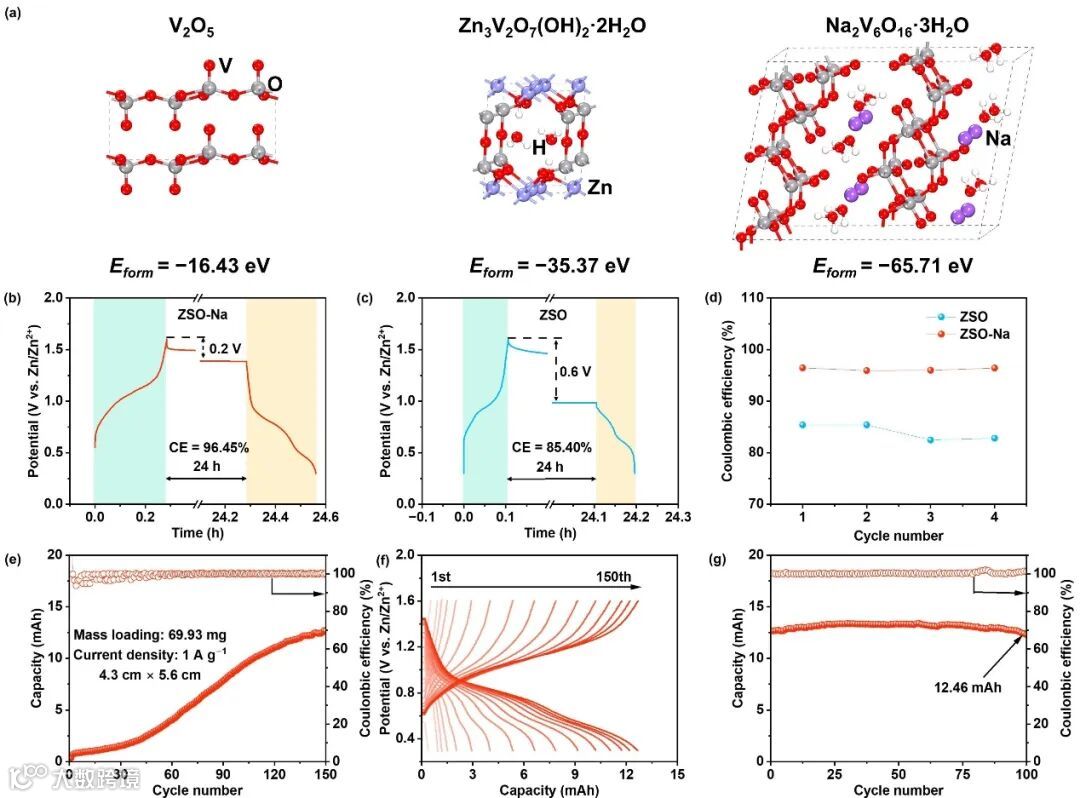 图5. a) 三种钒氧化物的结构模型及形成能;在1 A g−1电流密度下循环500次后,Zn|| V2O5电池在b) ZSO-Na和c) ZSO电解液中的自放电测试结果;d) 不同电解液中电池经过四次自放电测试的库仑效率;e) ZSO-Na电解液中软包电池活化过程的循环性能及f) 充放电曲线;g) 活化后软包电池的长循环性能。