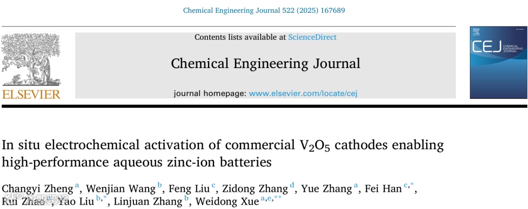 近日,来自电子科技大学的薛卫东教授与中国科学院上海应用物理研究所的刘瑶研究员和江西省科学院能源研究所的韩飞副研究员合作,在国际知名期刊Chemical Engineering Journal上发表题为“In situ electrochemical activation of commercial V2O5 cathodes enabling high-performance aqueous zinc-ion batteries”的研究文章。该研究揭示了V2O5正极的原位电化学活化机理,同时通过电解液设计诱导V2O5向Zn3V2O7(OH)2·2H2O/Na2V6O16·3H2O混合相转变,活化后的正极在1 A g−1下具有264 mAh g−1的高比容量,并且在活性物质负载量高的条件下成功活化正极,制备的软包电池在1 A g−1下具有12.66 mAh的可逆容量。