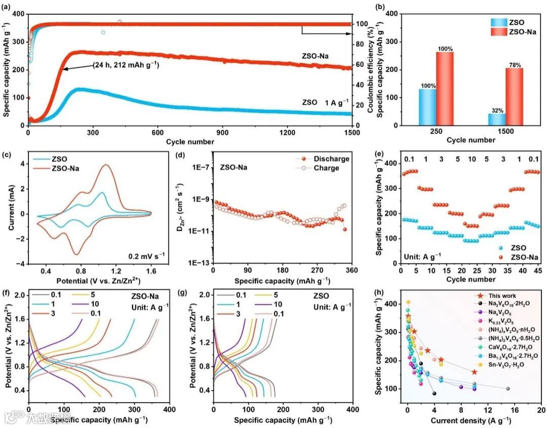 图1. a) Zn||V2O5电池在ZSO-Na和ZSO电解液中的长循环稳定性;b) 相应比容量的对比;c) 250次循环后正极材料的CV曲线;d) ZSO-Na中活化后正极材料中Zn2+的扩散系数;e) 倍率性能;f, g) 不同体系相应的充放电曲线;h) 不同正极材料倍率性能的对比。