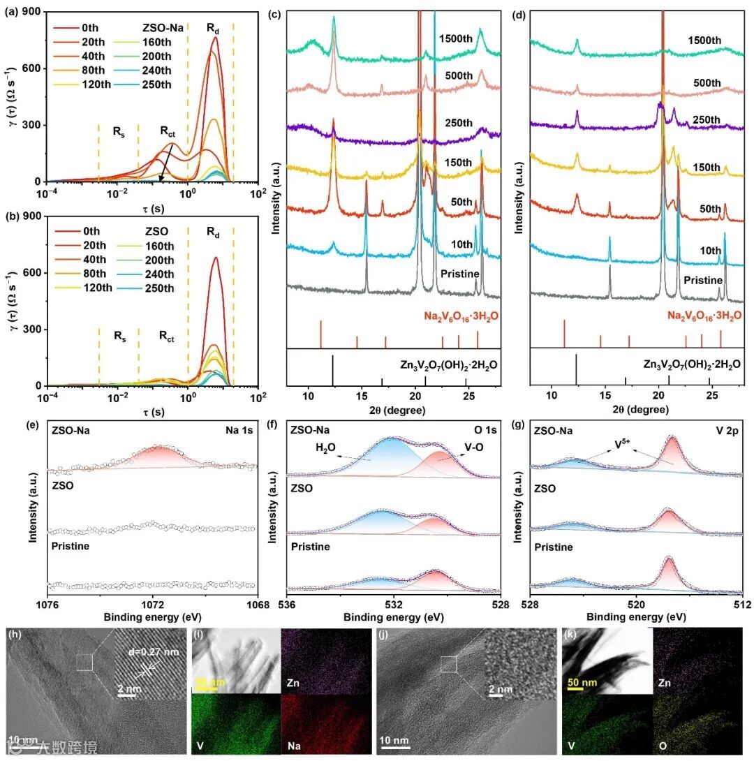 图2. a, b) Zn|| V2O5电池的弛豫时间分布分析结果;c, d) 不同电解液中正极材料在活化过程中的XRD图谱;e–g) 1500次循环后正极材料的XPS谱图;h, i) ZSO-Na电解液及 j, k) ZSO电解液中正极材料的TEM图像及EDS元素分布表征。