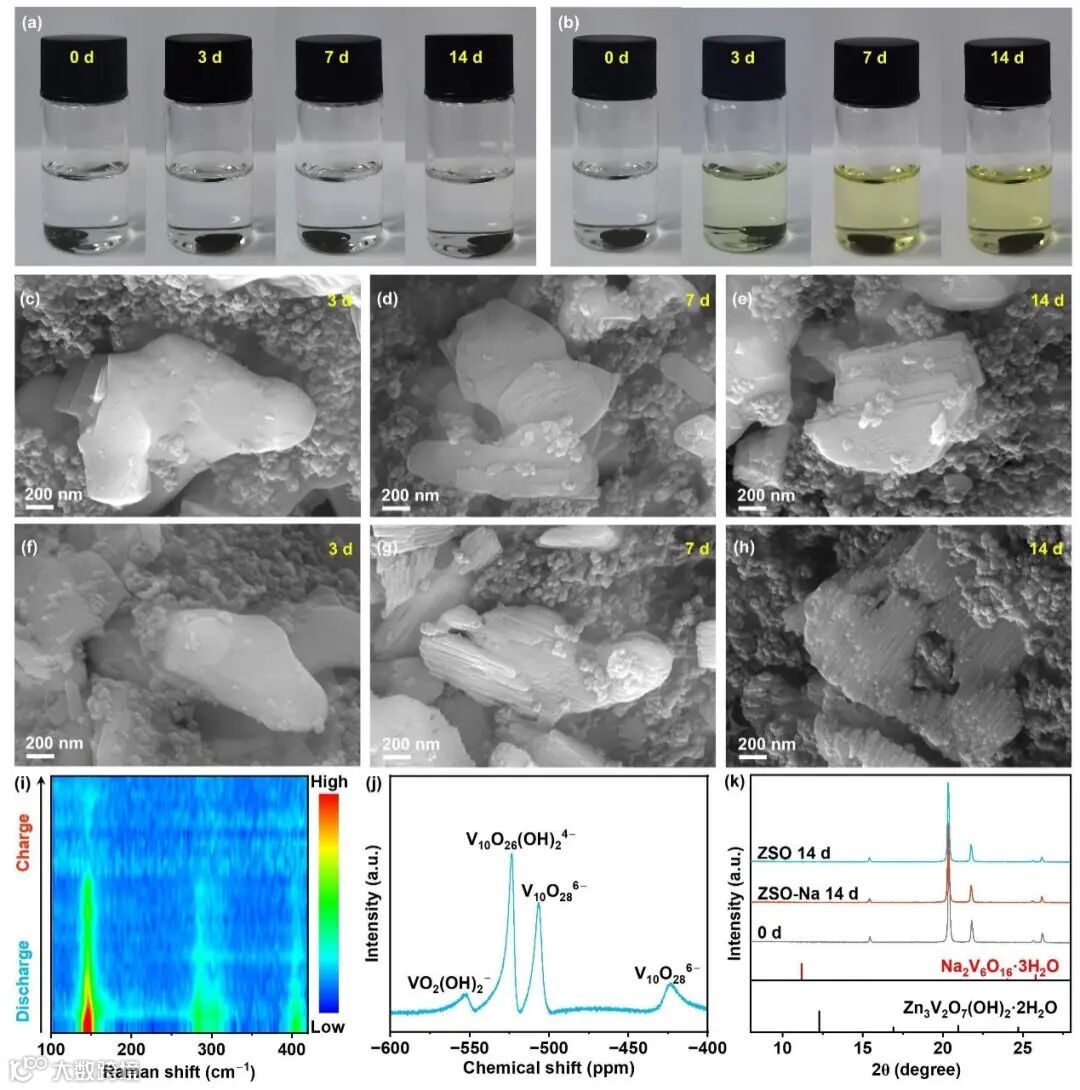 图4. V2O5正极在a) ZSO-Na和b) ZSO电解液中浸泡后的光学照片;c–e) ZSO-Na及f–h) ZSO电解液中浸泡后正极表面的SEM图像;i) 正极在ZSO-Na电解液中的原位拉曼光谱;j) V2O5在ZSO电解液中浸泡3天后所得上清液的51V NMR谱;k) 正极在ZSO-Na和ZSO电解液中浸泡14天后的XRD图谱。
