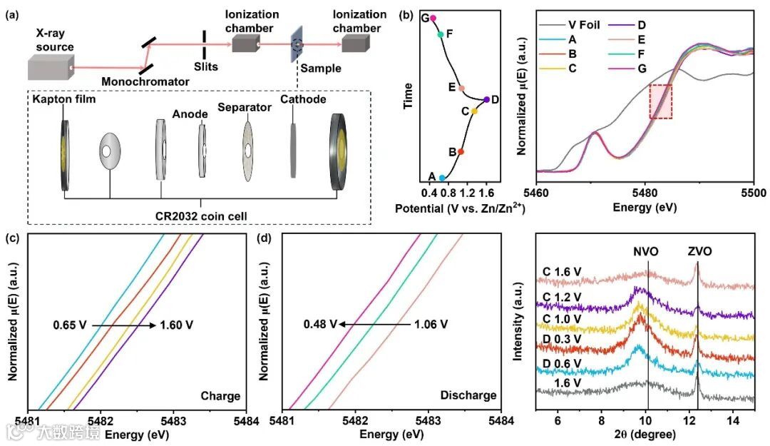 图3. ZSO-Na电解液中活化后正极的结构分析。a) 原位XANES表征过程示意图;b-d) 正极在充放电过程中的XANES结果;e) 正极的非原位XRD图谱。