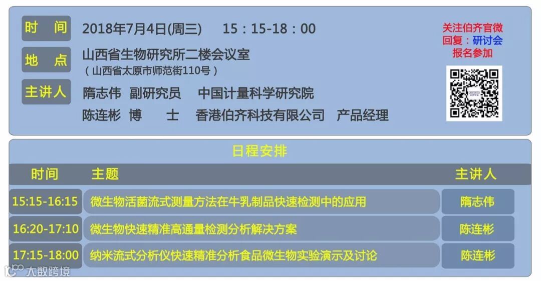 此次技术研讨会邀请中国计量科学研究院隋志伟副研究员和香港伯齐科技有限公司Apogee纳米流式仪产品专家陈连彬博士重点分享食品微生物快速精准高通量检测分析解决方案,热烈欢迎感兴趣老师报名参加。