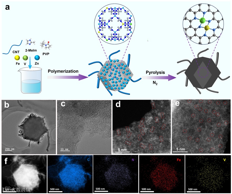 图1. (a) Schematic illustration of the synthesis of Fe1V1-NC. (b) TEM image and (c) HR-TEM image of Fe1V1-NC. AC-HAADF-STEM images of (d) Fe1V1-NC (The red squares represent Fe-V diatomic pairs) and (e) Fe1-NC (The red circles represent Fe single atoms.). (f) Elemental mapping for Fe1V1-NC.