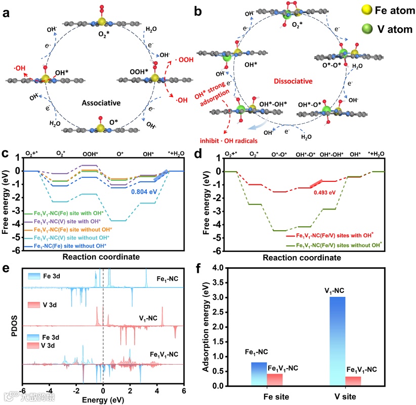 图3. Schematic diagram of (a) associative pathway for Fe1-NC and (b) dissociative pathway for Fe1V1-NC. Free energy diagram of ORRs on (c) Fe or V single site and (d) Fe-V dual sites. (e) The PDOS of central metal atoms in Fe1-NC, V1-NC and Fe1V1-NC. (f) Adsorption energy of OH* on the metal sites of Fe1-NC, V1-NC and Fe1V1-NC.
