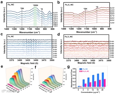 图5. In situ ATR-SEIRAS spectroscopies of (a) Fe1-NC and (b) Fe1V1-NC, respectively. In situ EPR spectra for monitoring ·OH radical of (c) Fe1-NC and (d) Fe1V1-NC, respectively. UV-vis spectra of (e) Fe1-NC and (f) Fe1V1-NC obtained by ABTS radical test. (g) Comparison of the absorbance at 417 nm for Fe1-NC and Fe1V1-NC