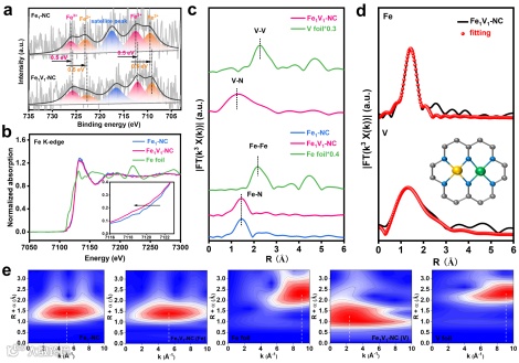 图2. (a) Fe 2p XPS spectra for Fe1-NC and Fe1V1-NC. (b) Fe K-edge XANES spectra (the inset shows a partial enlargement of the area near the onset of the near edge). (c) Fourier transform of k3-weighted EXAFS spectra of Fe1V1-NC, Fe1-NC, and reference Fe and V foils. (d) FT-EXAFS fitting curves of Fe1V1-NC in R space (the inset is optimized configuration of Fe1V1-NC). (e) Wavelet transforms of k3-weighted EXAFS spectra of Fe1-NC, Fe1V1-NC (Fe), Fe foil, Fe1V1-NC (V), and V foil.