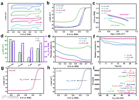 2. 优异的催化活性与稳定性:Fe1V1-NC在0.1 M KOH中ORR起始电位达1.02 V vs RHE,半波电位0.89 V vs RHE,均高于商业Pt/C和单原子Fe-N-C;50000次循环后半波电位衰减仅16 mV,衰减速率低至3.2×10-4 mV/循环,稳定性显著优于现有Fe-N-C催化剂。