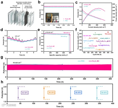 3. 高效锌空气电池性能:基于Fe1V1-NC的锌空气电池开路电压1.50 V,峰值功率密度237 mW·cm-2,高于Pt/C的211 mW·cm-2;在10 mA·cm-2下循环400小时无电压衰减,比容量达795 mAh·g-1,综合性能处于国际领先水平。
