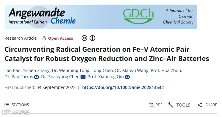 近日,中南大学邱晓清教授、陈善勇教授团队联合爱尔兰国立高威大学等单位,在国际知名期刊《Angewandte Chemie International Edition》发表题为“Circumventing Radical Generation on Fe–V Atomic Pair Catalyst for Robust Oxygen Reduction and Zinc–Air Batteries”的研究论文。该团队通过密度泛函理论DFT指导设计,成功构建具有N2Fe-N2-VN2构型的Fe-V原子对催化剂Fe1V1-NC,首次实现通过切换氧还原反应ORR路径从根源上避免活性氧物种ROS生成,显著提升催化剂的活性与稳定性。基于此催化剂组装的锌空气电池展现出超长循环寿命400小时,为金属空气电池、燃料电池等能源器件的高效稳定运行提供全新解决方案。
