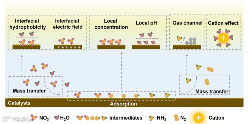 图2. 多尺度微环境工程影响NO3RR过程的因素示意图。各因素分别作用于NO3RR过程中的反应物吸附、中间体转化及产物脱附环节。