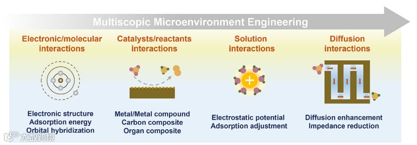 图1. 多尺度微环境工程及其在硝酸盐还原反应(NO3RR)中应用的示意图。