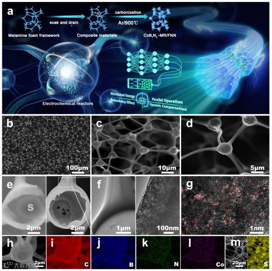 a) CoB1N3-MR/FNN合成示意图。b–d) CoB1N3-MR/FNN的扫描电子显微镜(SEM)图像。e) CoB1N3-MR/FNN中一个微反应器单元的SEM图像,右侧为硫负载前,左侧为硫负载后。f) CoB1N3-MR内腔的透射电子显微镜(TEM)图像(左)和CoB1N3-MR结构的TEM图像(右)。g) CoB1N3-MR/FNN外壳的高角环形暗场扫描透射电子显微镜(HAADF-STEM)图像。h–l) CoB1N3-MR/FNN中C、B、N和Co元素的能谱(EDS)分布图。m) 硫负载后CoB1N3-MR/FNN中S元素的EDS分布图。