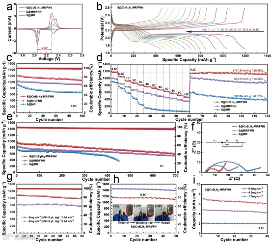 a) 1 mV·s⁻¹下的典型循环伏安(CV)曲线。b) S@CoB1N3-MR/FNN在不同倍率下的充放电曲线。c) 0.2 C下的循环性能。d) 倍率性能。e) 1 C下的长循环性能。f) 纽扣电池的Nyquist图和等效电路图。g) 高硫负载和低电解液条件下S@CoB1N3-MR/FNN正极的循环性能。h) S@CoB1N3-MR/FNN软包电池在0.2 C下的循环性能(插图为软包电池折叠前后正常工作的照片)。i) 不同硫负载量下S@CoB1N3-MR/FNN在0.2 C下的面积容量。