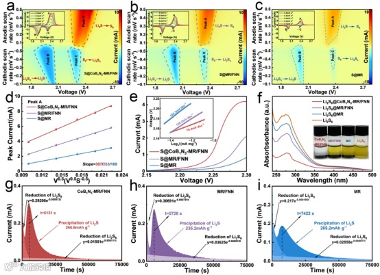 a–c) S@CoB1N3-MR/FNN(a)、S@MR/FNN(b)和S@MR(c)正极在0.1–0.5 mV·s-1扫描速率下的循环伏安(CV)曲线等高线图。d) 峰A的CV峰值电流与扫描速率平方根的关系图。e) 峰A的Tafel图。f) 不同样品吸附Li2S6溶液6小时后的紫外-可见吸收图谱(插图为Li2S6吸附实验的数码照片)。g–i) Li2S8溶液在CoB1N3-MR/FNN(g)、MR/FNN(h)和MR(i)不同表面上的恒电位放电曲线。