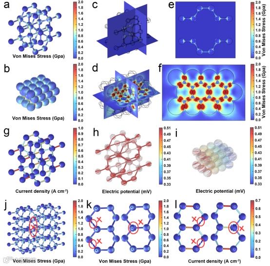 a-b) CoB1N3-MR/FNN (a)和CoB1N3-MR (b)结构的整体应力分布图。c-d) CoB1N3-MR/FNN 和 CoB1N3-MR (d)结构的应力多截面图。e-f) CoB1N3-MR/FNN (e)和CoB1N3-MR (f)结构在横截面上应力切面图的放大。g) CoB1N3-MR/FNN结构的电流密度模量颜色映射图。h) CoB1N3-MR/FNN结构的电流密度模量流线和电势分布图。i) CoB1N3-MR结构的电流密度模量流线和电势分布图。j) 局部连接损坏后CoB1N3-MR/FNN结构的整体应力分布图。k) 局部损坏后CoB1N3-MR/FNN结构的局部应力分布图。l) 局部损坏后CoB1N3-MR/FNN结构的局部电流密度模量颜色映射图。