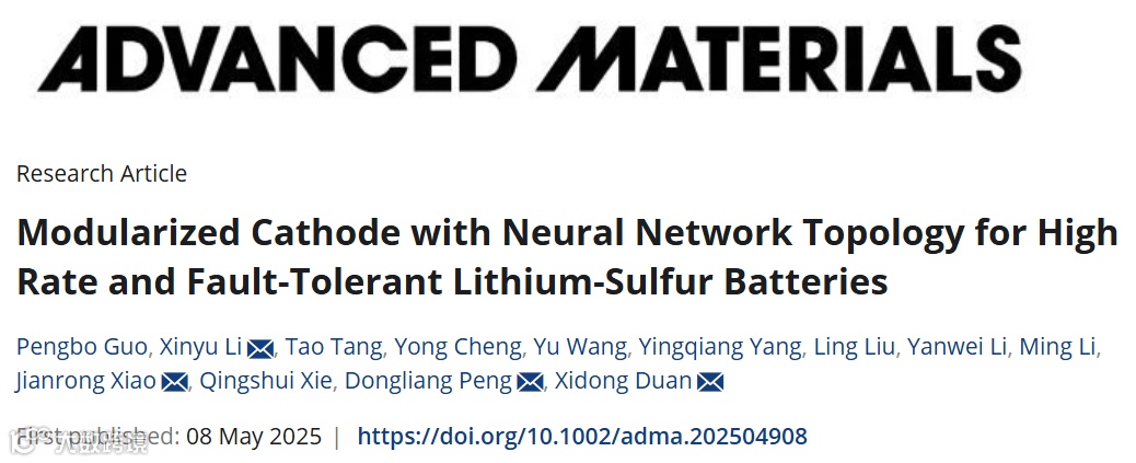 Pengbo Guo, Xinyu Li,* Tao Tang, Yong Cheng, Yu Wang, Yingqiang Yang, Ling Liu, Yanwei Li, Ming Li, Jianrong Xiao,* Qingshui Xie, Dongliang Peng,* and Xidong Duan*. Modularized Cathode with Neural Network Topology for High Rate and Fault-Tolerant Lithium–Sulfur Batteries. Advanced Materials, 2025, 2504908.