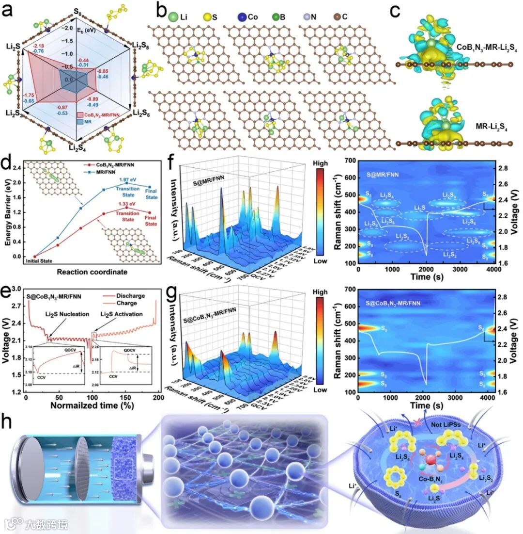 a) S8, Li2S8, Li2S6, Li2S4, Li2S2和Li2S在CoB1N3-MR和MR表表面的吸附/结合能以及分子构型(插图显示了LiPSs在CoB1N3-MR上的优化吸附构型)。b) LiPSs在CoB1N3-MR上键合模式的俯视图。c) Li2S4在CoB1N3-MR和MR上的差分电荷密度。d) CoB1N3-MR/FNN和MR/FNN表面上Li离子的扩散势垒(插图为Li离子在CoB1N3-MR/FNN和MR/FNN表面的扩散路径)。e) S@CoB1N3-MR/FNN正极在0.1 C下的恒电流间歇滴定技术(GITT)曲线。f-g) S@MR/FNN正极(f)和S@CoB1N3-MR/FNN正极(g)的原位拉曼图谱。h) CoB1N3-MR/FNN正极的工作机制。