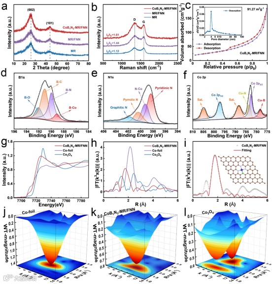 a) CoB1N3-MR/FNN、MR/FNN和MR的X射线衍射(XRD)图谱。b) CoB1N3-MR、MR/FNN和MR的拉曼图谱。c) CoB1N3-MR/FNN的N2吸附/脱附等温线。d) CoB1N3-MR/FNN的B 1s、e) N 1s和f) Co 2p的X射线光电子能谱(XPS)图谱。g) Co K边的X射线吸收近边结构(XANES)谱。h) Co K边的扩展X射线吸收精细结构(EXAFS)谱的傅里叶变换,Co箔和Co3O4作为对比。i) CoB1N3-MR/FNN的EXAFS拟合曲线。j–l) Co K边的小波变换(WT)等高线图,分别为j) Co箔,k) CoB1N3-MR/FNN,l) Co3O4。