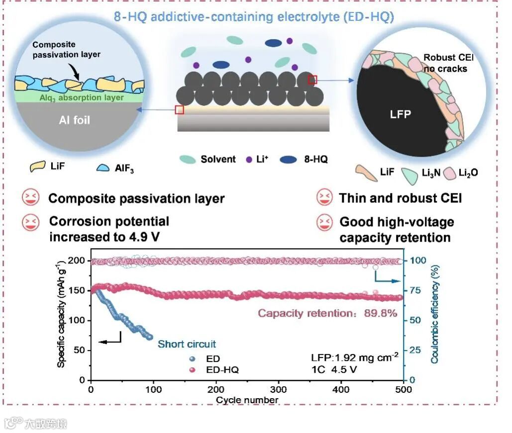 在本研究中,证明了添加8-HQ是至关重要的,成功调节了溶剂化结构,形成稳定的阴极电解质界面(CEI),并抑制在高电压下铝集流体(AlCC)的腐蚀。这种通用的钝化策略,引入的8-HQ优先在正极材料表面和铝集流器表面形成吸附层。吸附的8-HQ在阴极表面分解,形成厚度均匀(约10 nm)的富含无机物Li3N的CEI。这种致密且均匀的CEI确保了在高电压下阴极的循环稳定性。同时,在铝集流体表面通过物理和化学吸附形成8-羟基喹啉铝(Alq3)螯合层和AlF3/LiF无机层的复合钝化层,这将铝集流体的稳定工作电压提高到了4.9 V。结果表明,使用ED-HQ电解液的全电池的循环性能优于使用ED电解液的电池,即使在4.5 V下经过500次循环后仍能保持高达89.8%的容量保留率。这种电解质设计策略在多种高压阴极系统中表现出了极佳的兼容性。我们的研究有望为高压锂离子电池的电解质设计提供一种高效的方法。
