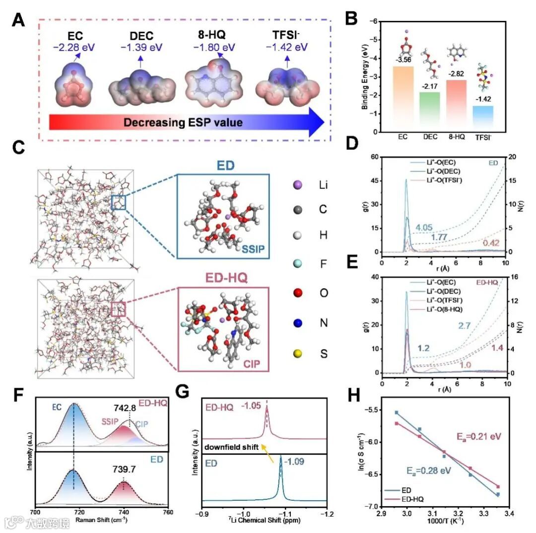 如图1C所示,传统LiTFSI碳酸酯类电解质(ED)因其高解离度易于形成SSIP溶剂化结构,通过引入8-HQ添加剂(ED-HQ)诱导形成CIP结构,改变溶剂化结构,从而优化电解质物化性能。通过图1F中的Raman分析结果可得ED-HQ电解质相较于ED电解质出现了CIP溶剂化结构,图1G的7Li-NMR光谱中ED-HQ电解质的下场位移同样证明了这一点。通过提高溶剂化结构中CIP的比例,改善了电解质的性能,如提高Li+迁移数(tLi+=0.53)并降低离子迁移能垒(Ea=0.21 eV)与活化能垒(Eb=21.98 kJ mol-1)(图1H)等。