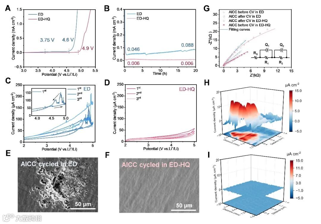 图 3.铝集流体的腐蚀行为。(A)在不同电解质中以0.1 mV s−1的扫描速率进行的锂|铝半电池的 LSV 曲线。(B)不同电解质下锂|铝半电池在4.3 V时的 CA 图谱。(C)和(D)为使用(E)ED和(F)ED-HQ电解质的锂|铝半电池的CV曲线。通过(G)ED和(H)ED-HQ电解质进行的循环铝集流体测试所获得的SEM图像。(I)不同电解质下锂|铝半电池的EIS图谱。使用(J)ED和(K)ED-HQ电解质对测试后的铝集流体的SVET测试。