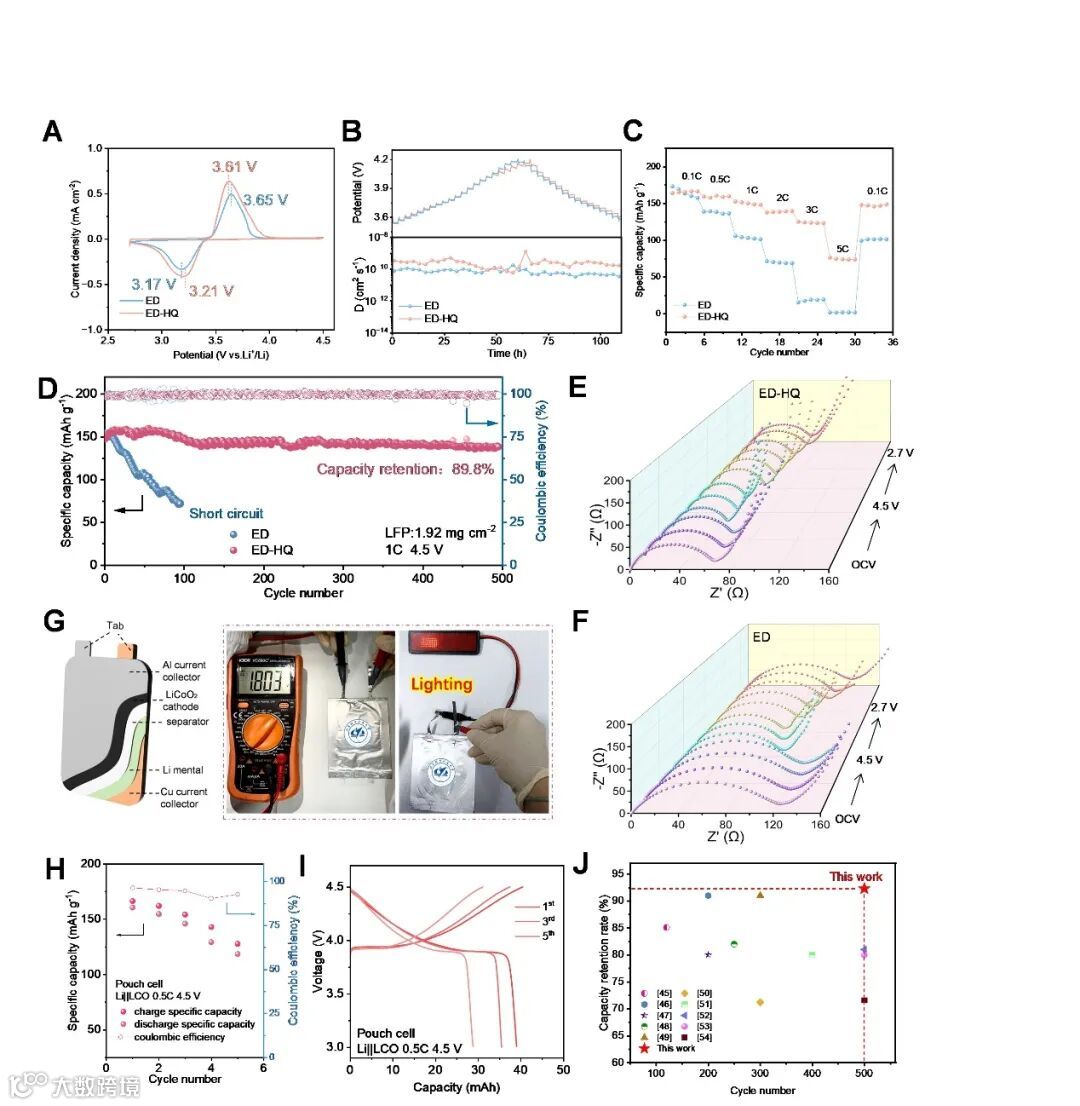图 5.全电池的电化学性能。(A)在扫描速率5 mV s−1下,Li|ED-HQ|LFP和锂|ED|LFP全电池的循环伏安曲线。(B)Li|ED-HQ|LFP和Li|ED|LFP全电池的恒电流充放电曲线以及计算得出的锂离子扩散系数的GITT测量结果。(C)Li|ED-HQ|LFP 和Li|ED|LFP电池的速率性能。(D)在 1C 截止电压4.5 V下,Li|ED-HQ|LFP和Li|ED|LFP全电池的长期循环性能。使用不同电解质获得的Li||LFP全电池的奈奎斯特图(通过原位EIS测试获得)。(E)ED-HQ,(F)ED。(G)在充电前和充电后点亮的软包电池开路电压测量的原理图和演示图。(H)Li|ED-HQ|LCO软包电池的循环性能。(I)在0.5C截止电压4.5 V下,Li|ED-HQ|LCO软包电池的充放电曲线。(J)最近报道的全电池性能的比较。
