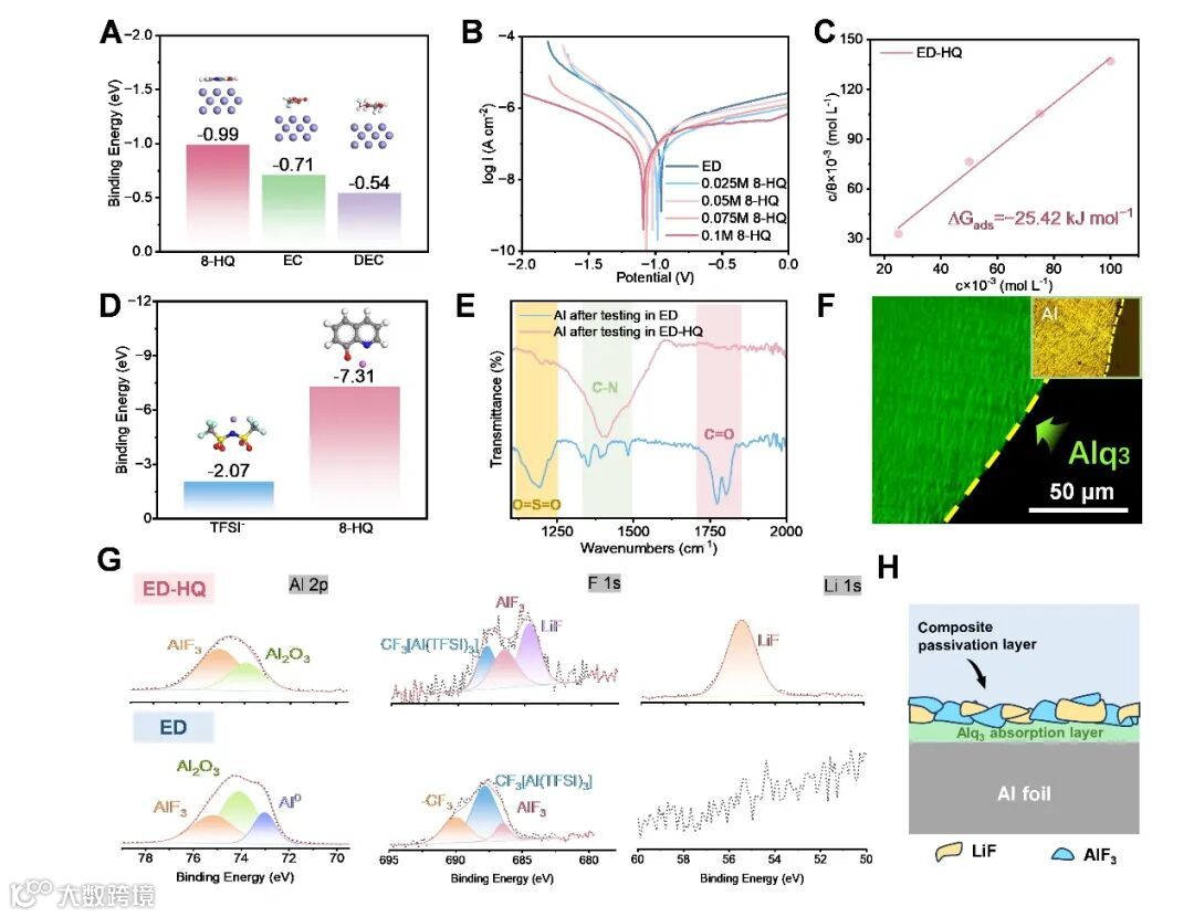 图 4.对AlCC表面钝化膜的表征。(A)溶剂和8-HQ在Al(100)晶面上的吸附能。(B)在含有不同浓度8-HQ的ED电解液中进行的Al||Al电池的塔菲尔曲线。(C)在含有不同浓度8-HQ的ED电解液中循环的Al||Al电池中c/θ与c的关系图。(D)TFSI−和8-HQ与Al3+的结合能。(E)在不同电解液中循环后的AlCC的傅里叶变换红外光谱。(F)使用荧光显微镜对在ED-HQ电解液中循环后的AlCC进行表征,右上角的插图显示了在光学显微镜下AlCC的形态。(G)在不同电解液中循环后的AlCC的XPS光谱比较。(H)在ED-HQ电解液中生成的AlCC表面钝化膜的示意图。
