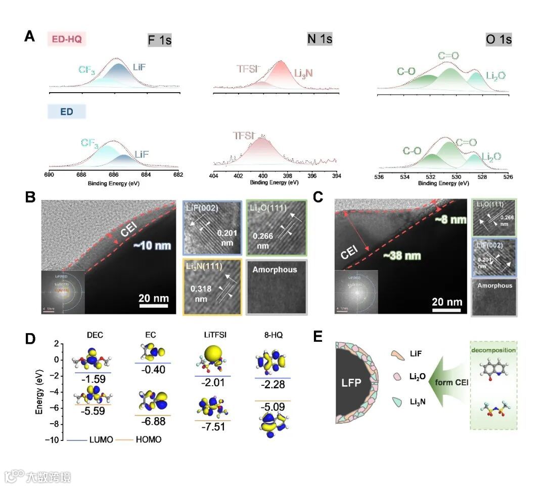 图 2.LFP正极在 ED-HQ 电解液中的界面稳定性。(A)不同电解液中循环后的正极的高分辨率XPS光谱对比图。在(B)ED-HQ电解液和(C)ED电解液中循环后的正极的透射电子显微镜图像及高分辨率透射电子显微镜放大图像。(左下角的图示为电子衍射图。)(D)电解质成分的LUMO和HOMO等值面图。(E)在 ED-HQ 电解液中生成的CEI层的成分示意图。
