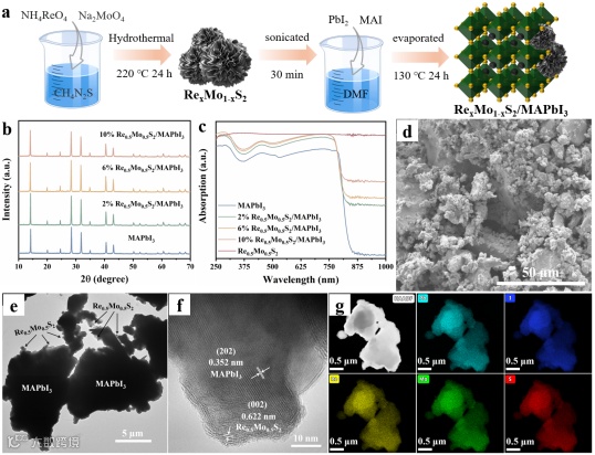 图2. (a) RexMo1-xS2/MAPbI3复合材料的合成过程示意图;(b) MAPbI3及2%、6%、10% Re0.5Mo0.5S2/MAPbI3的XRD图谱;(c) MAPbI3、Re0.5Mo0.5S2及其复合材料的紫外-可见漫反射光谱(UV-vis DRS);(d) 6% Re0.5Mo0.5S2/MAPbI3的扫描电镜(SEM)图像;(e) 透射电镜(TEM)图像;(f) 高分辨TEM(HRTEM)图像;(g) Pb(青色)、I(蓝色)、Re(黄色)、Mo(绿色)和S(红色)在6% Re0.5Mo0.5S2/MAPbI3中的能谱元素分布图。